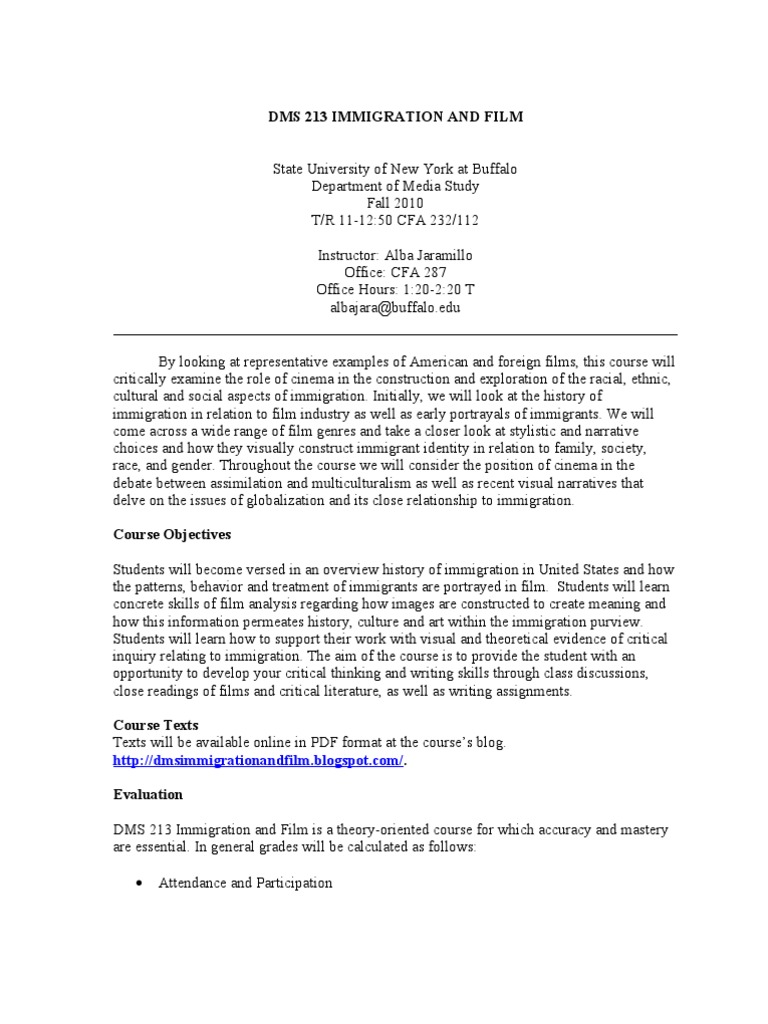 Immigration and Film Syllabus Fall 2010 PDF Plagiarism Immigration